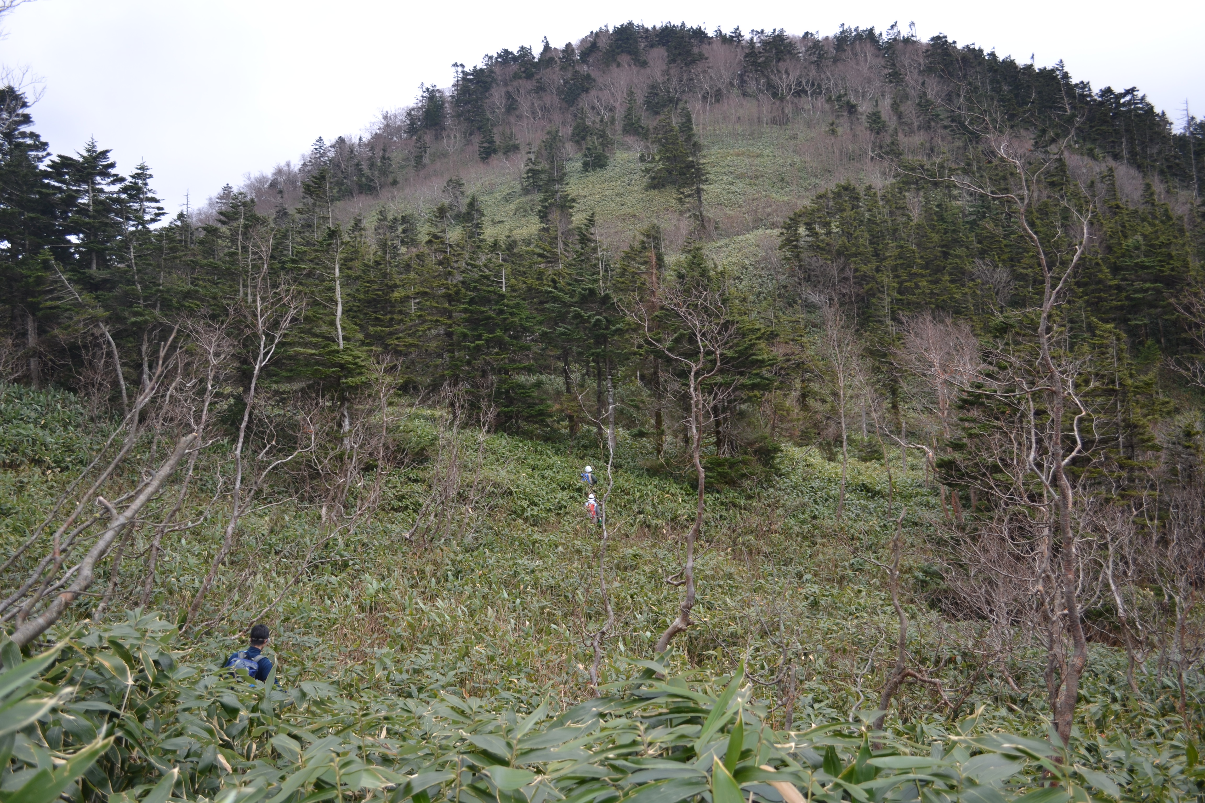 (左)ザレガヒラ(崩壊地露頭)と(右)同・樹林帯、表土が薄い